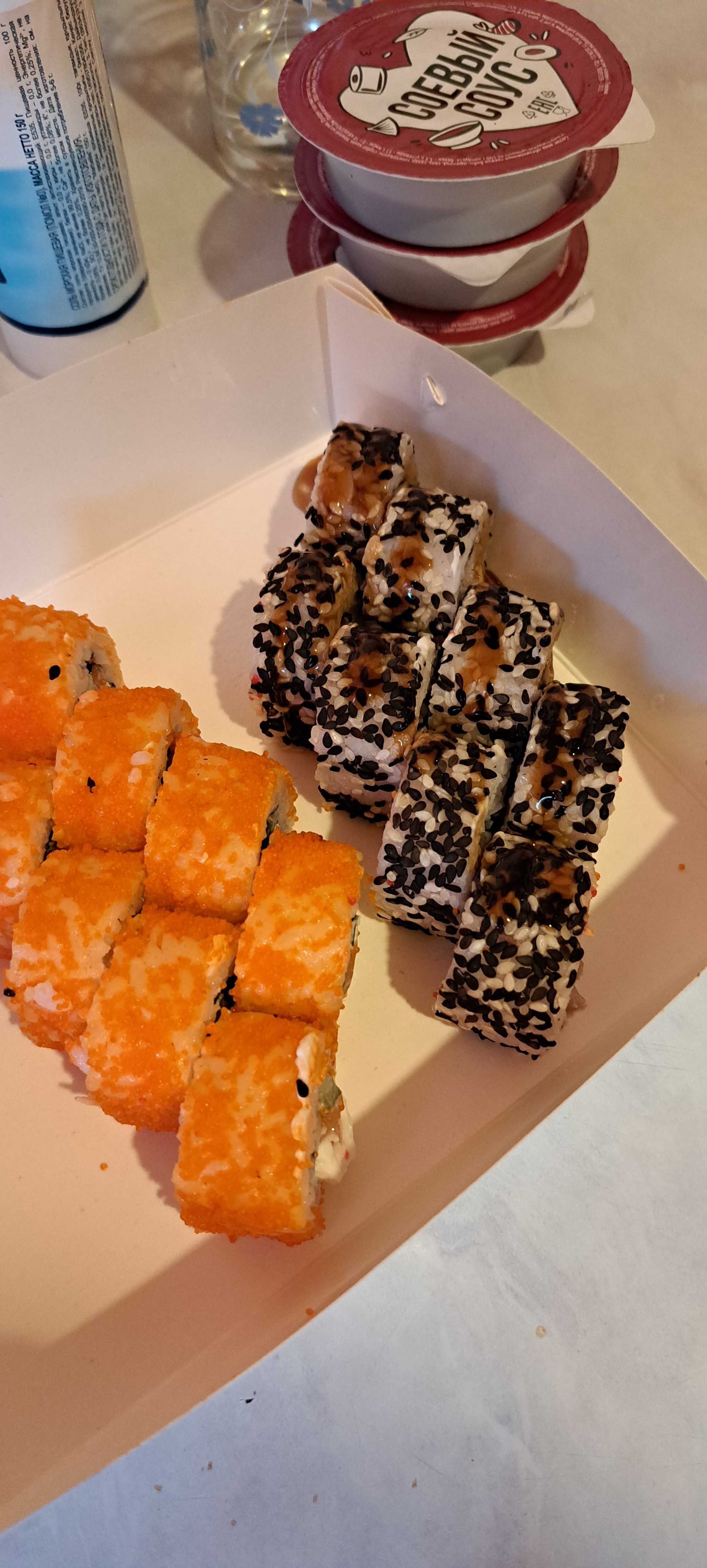 Не знаю, чего все так восхищаются. Решили попробовать, т.к всегда берем в другой фирме. Маленькие, т.е обычной порцией уже не наешься, вкус этих "шапочек" майонезный и жирный, рис рассыпается, не успеваешь к соусу поднести. Не знаю, может кому такое и нравится, но мы больше брать не будем. Берем такие в Хабаровске, на Ленинградской, вкус совсем другой, намного вкуснее, чем в Комсомольске.